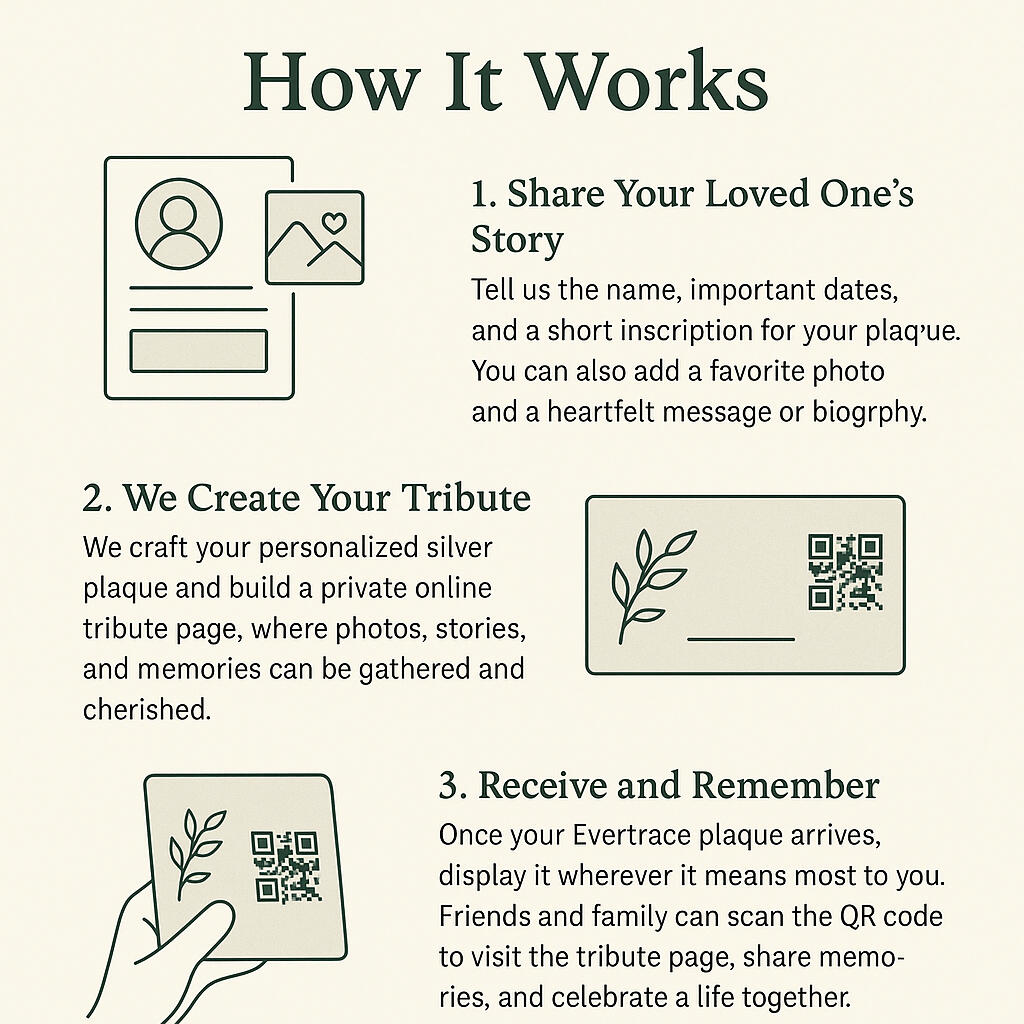 Evertrace offers modern, durable QR code plaques for memorials. Each plaque links to a private, customizable online tribute page where family and friends can share photos, stories, and memories.2. How does the process work?- Share your loved one’s story and details via our order form.- We create your personalized plaque and set up a digital tribute page.- You receive your plaque, and friends and family can visit the page by scanning the QR code.3. What information do I need to provide to create a tribute?